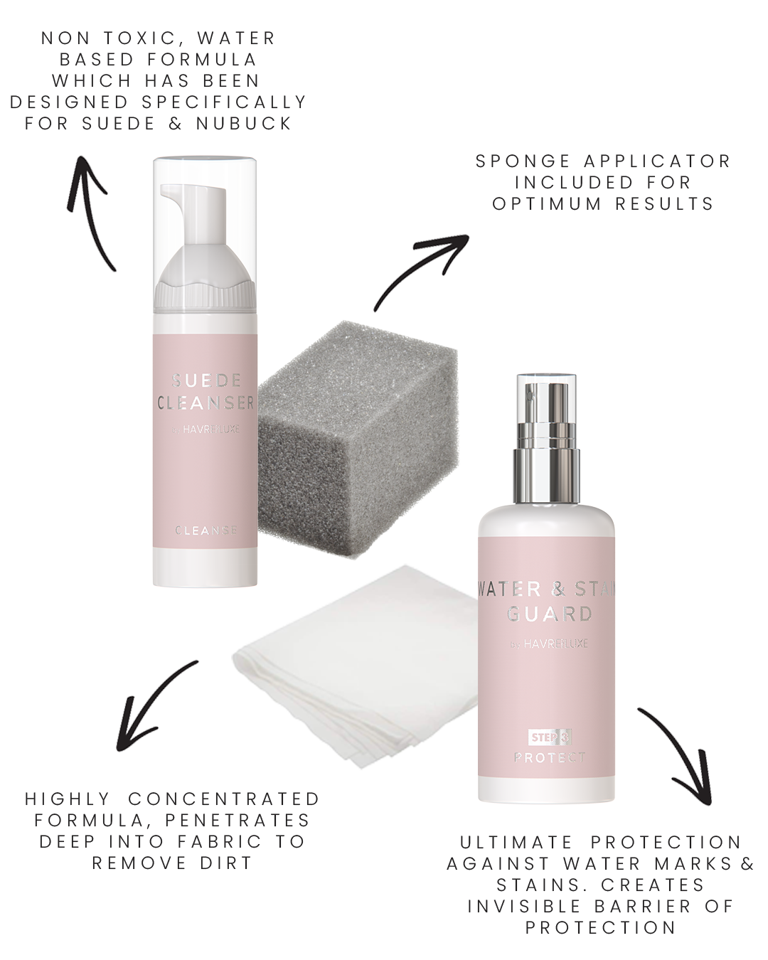 • Sponge Applicator & Application Cloth: For precise and even application, ensuring your suede remains protected and spotless.